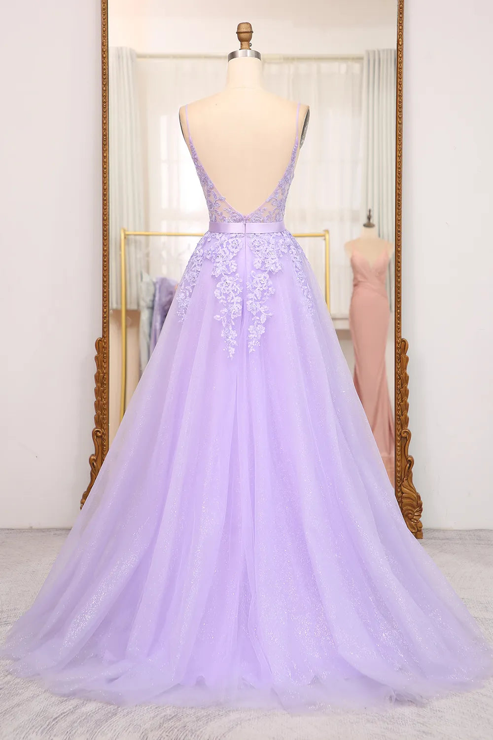 Langes Ballkleid in A-Linie mit Spaghettiträgern und Applikationen
