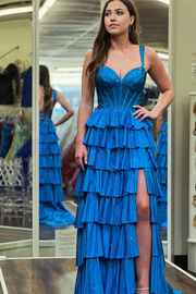 A-Linie, glitzernd, herzförmiger Ausschnitt, langes Abendkleid aus blauem Satin mit Schlitz