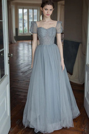 A-Linie, quadratischer Ausschnitt, grau, langes Abendkleid, Ballkleid mit Perlenbesatz