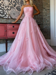 A-Linie trägerlos Tüll Applikation Lange Ballkleider Lange formelle Abendkleider