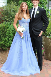 A-Linie Herzausschnitt Blau Tüll Lange Abendkleider formelles Kleid Ballkleider mit Applikationen