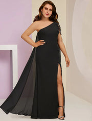 Kleider für die Brautmutter, Übergröße, geschwungen, Bauch verbergen, Hochzeitsgast, Party, sexy, eine Schulter, bodenlang, Chiffon, ärmellos, mit Perlenbesatz, geteilte Vorderseite - US 2 / UK 6 / EU 32