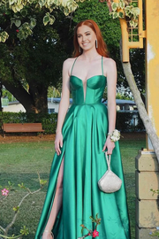 A Line Sweetheart Green Satin Long formal dress evening gown Prom Dresses with Slit