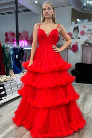 A Line V Neck Cute Red Tulle Long Prom Dresses