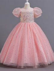 Kids Girls' Party Dress Solid Color Flower Short Sleeve Performance Wedding Sequins Elegant Princess Polyester Maxi Tulle Dress Summer Spring 4-13 Years Multicolor White Pink - Pink