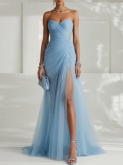 Light Blue Ruched Slit Tulle Strapless Sleeveless Sheath Gown Dress